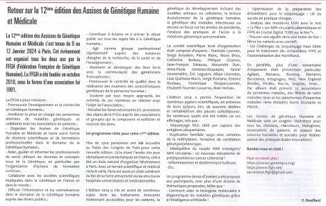 La 12ème édition des Assisses de Génétique Humaine et Médicale s’est tenue du 9 au 12 Janvier 2024 à Paris. Cet événement est organisé tous les deux ans par la FFGH (Fédération Française de Génétique Humaine). La FFGH a été fondée en octobre 2010, sous la forme d’une association loi 1901.